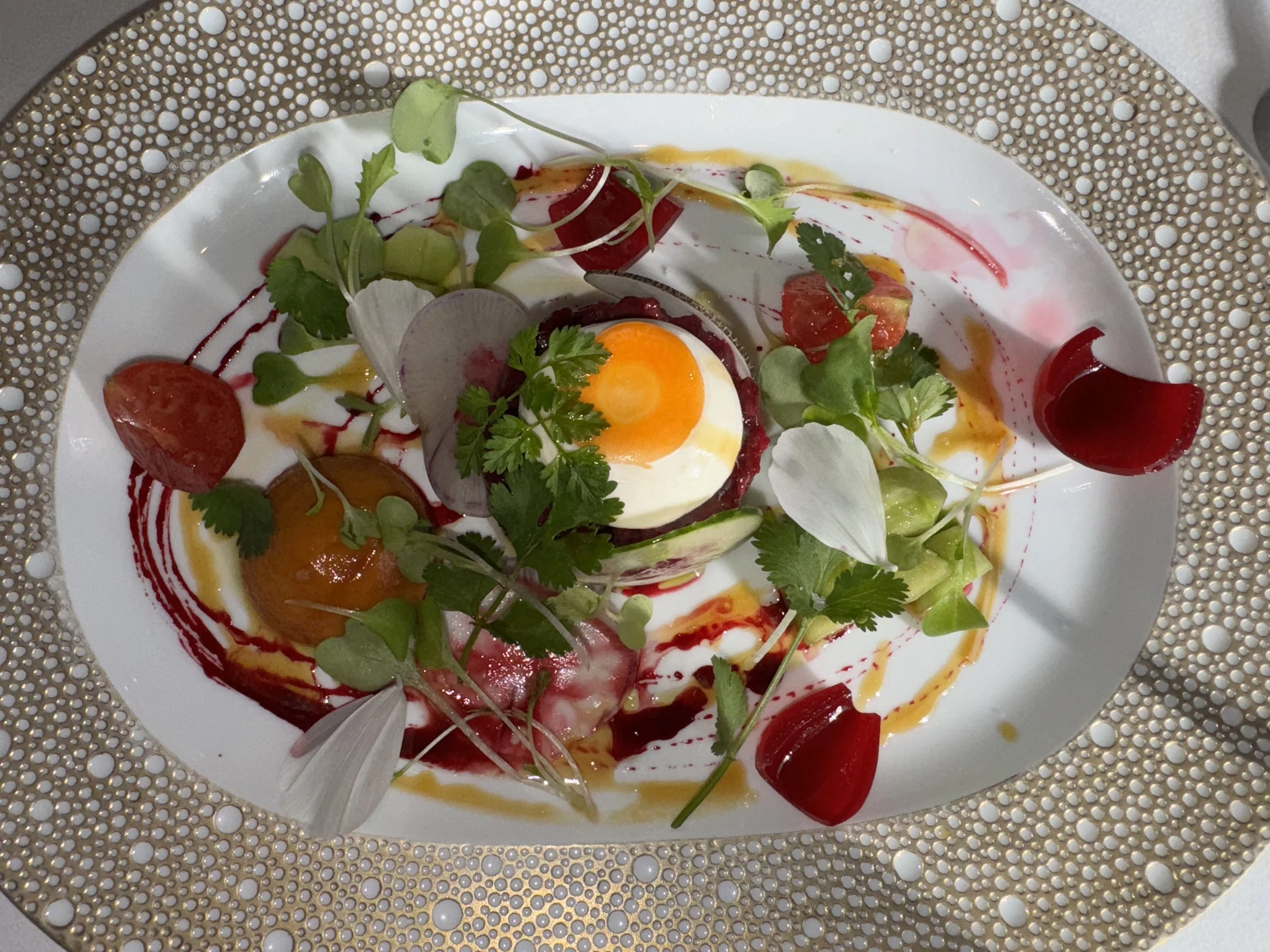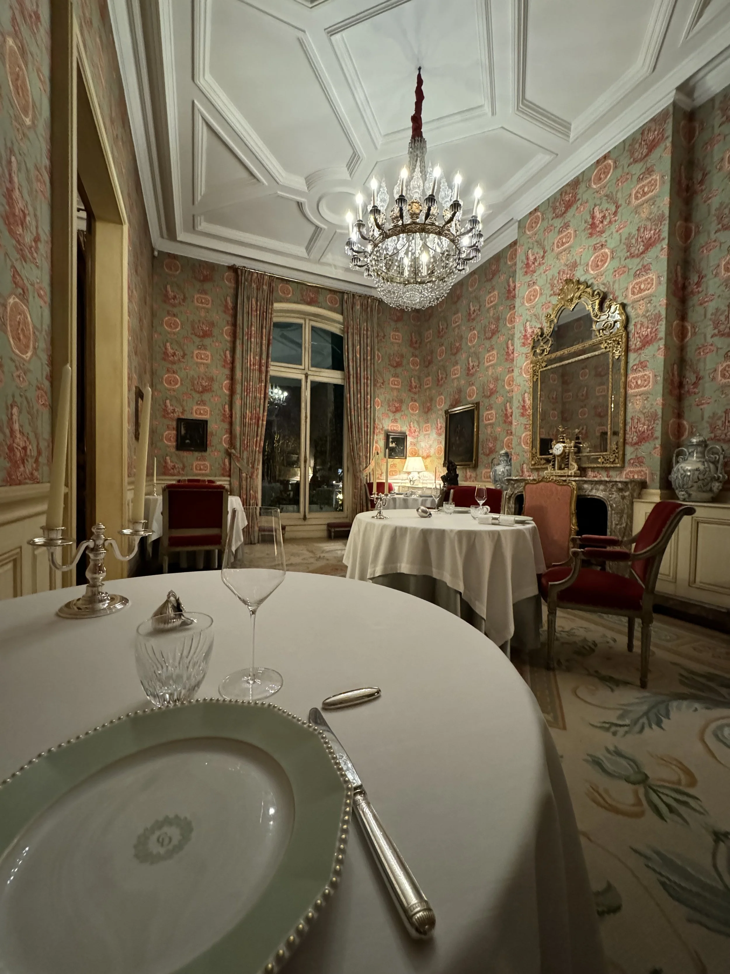 Le Clarence is high end French dining at its most unapologetic. Housed in a 19th century private mansion just off the Champs-Élysées, it is ostentatious in the best possible way. Gold engravings, chandeliers, wallpaper, and each dining room feeling like a different room in a wealthy aristocrat’s home. Walking in, I remember thinking: someone very rich and very French used to live here.